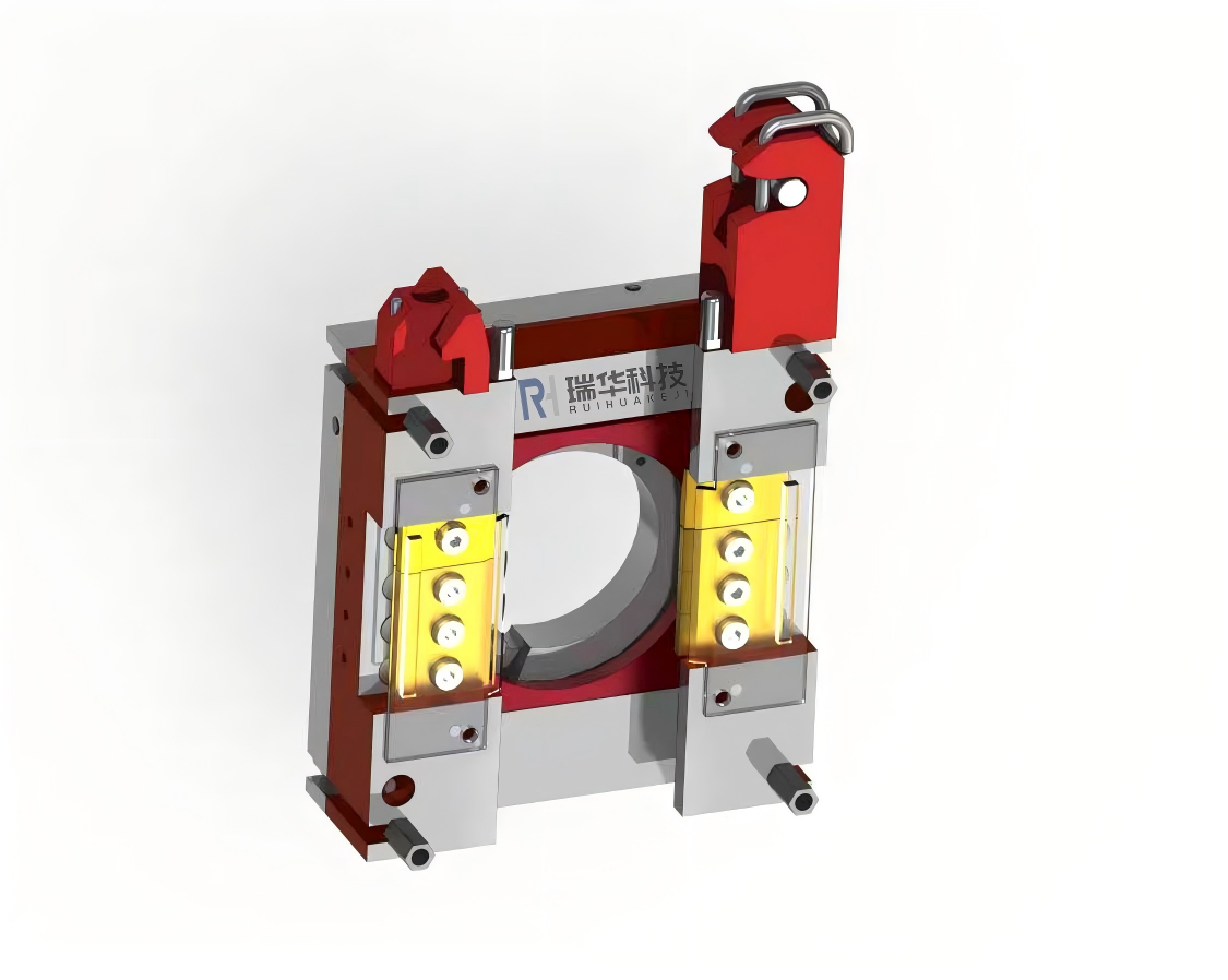 The tundish slab quick-change mechanism consists of a base assembly, a bracket assembly, a drive assembly, and refractory materials. To change the nozzle, place the nozzle in the ready position, activate the hydraulic cylinder, and push the nozzle into the working position, replacing the original nozzle in less than 1 second.